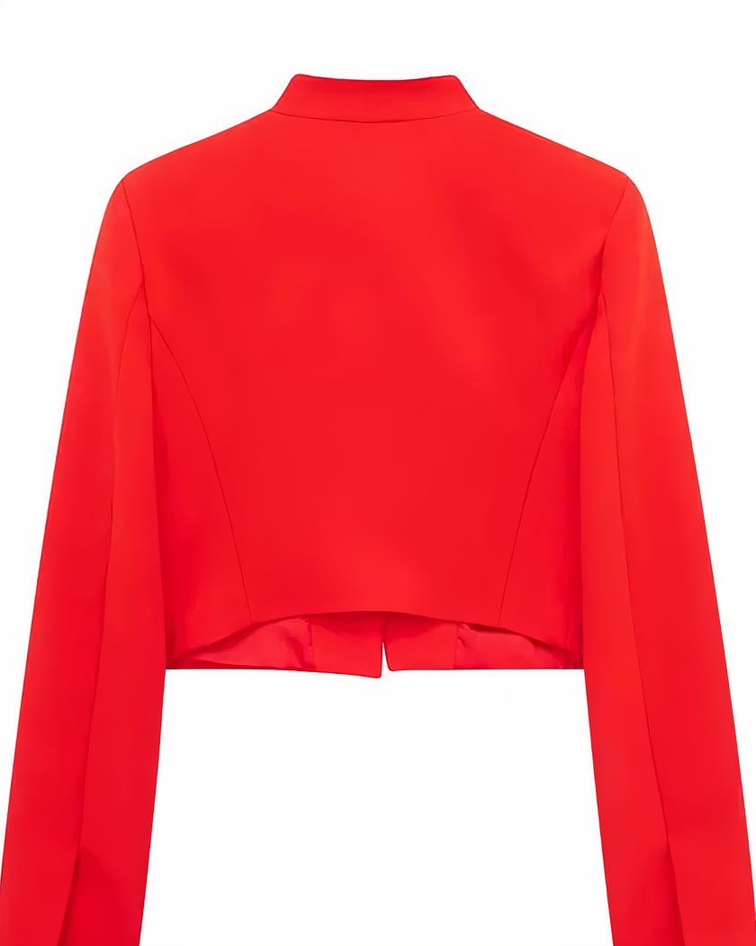 Sa couleur rouge vibrante ajoute une dose de glamour et de féminité à votre look. Fabriqué dans un tissu de qualité, ce blazer est à la fois confortable et durable. Son design court et croisé lui donne une allure moderne et tendance, parfaite pour les occasions spéciales ou pour une journée au bureau.