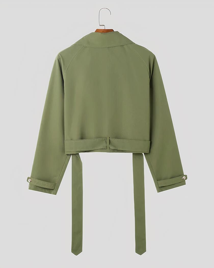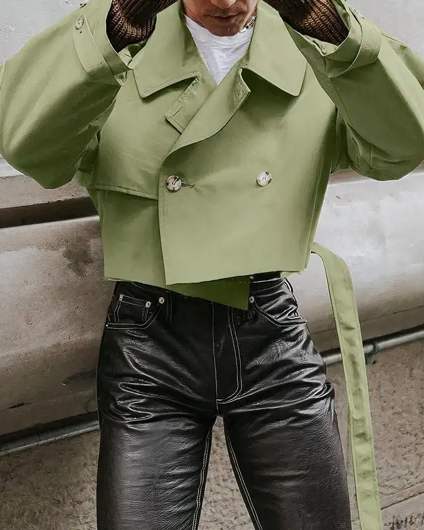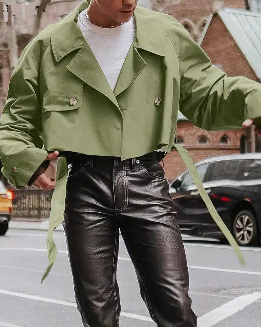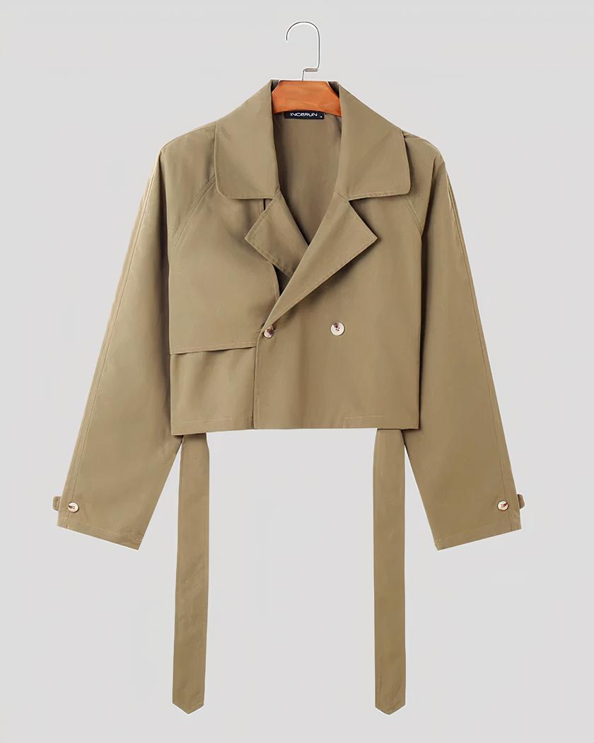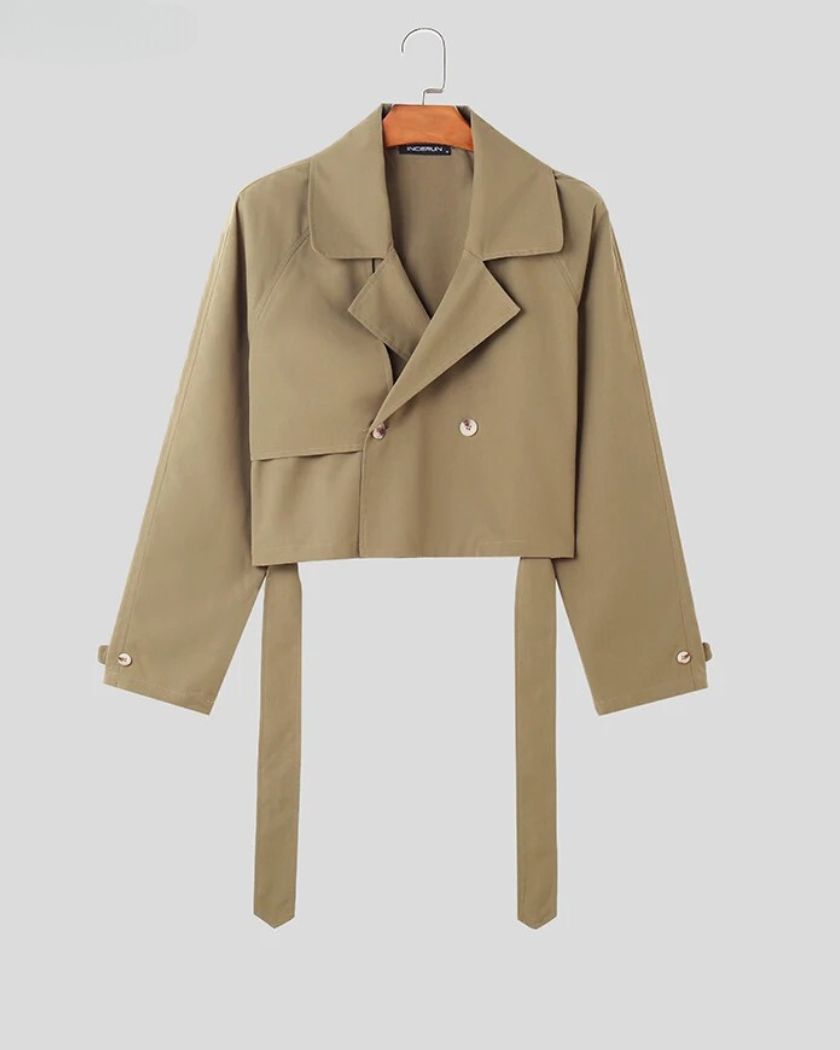 Ce blazer court homme possède un design large et décontracté, croisé avec un rabat de tissu sur le côté droit. Les manches raglan sont longues et le col à larges revers. Le tout a une allure plutôt casual très stylée et très tendance pour être porté en journée au travail, ou pour les loisirs.
