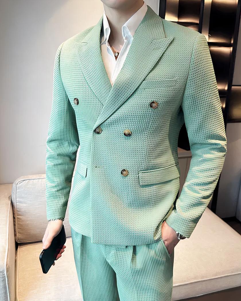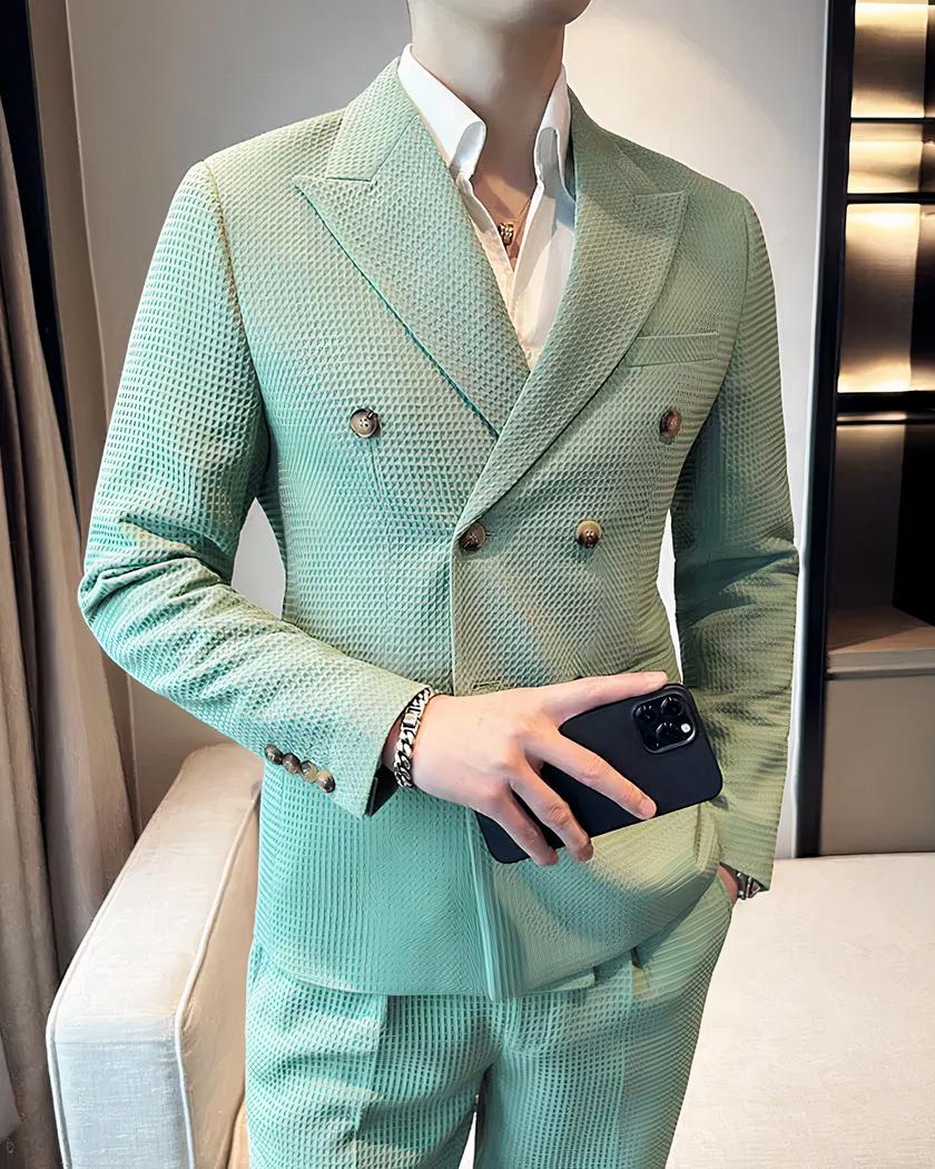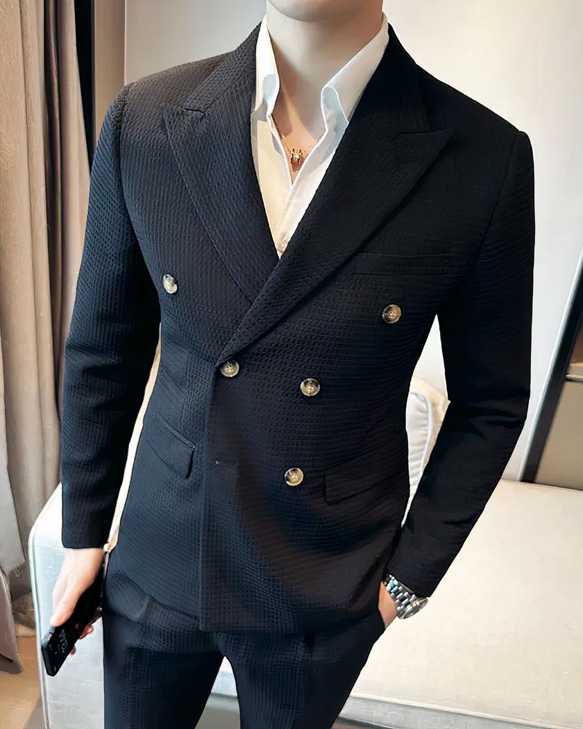 Les détails soignés tels que les boutons, les poches fonctionnelles et les revers classiques complètent le look chic de cet ensemble. Que ce soit pour une réunion d'affaires, un mariage ou une soirée élégante, notre blazer croisé avec son pantalon en tissu gaufré pour homme est un choix sûr pour ceux qui veulent faire bonne impression avec style et classe.