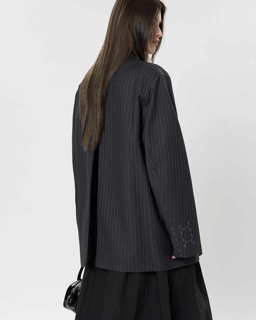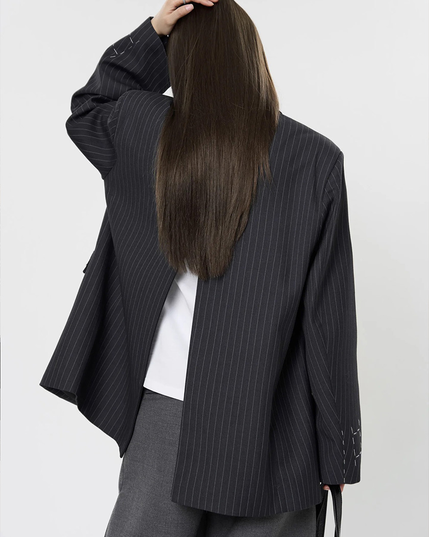 Vous avez envie de briser les codes avec panache ? Le blazer oversize à dos fendu pour femme et sa teinte à mi-chemin entre le noir et le gris anthracite à fines rayures enveloppe généreusement votre silhouette, tandis que l’ouverture arrière dessine un mouvement inattendu. Une allure avant‑gardiste pour un confort assumé.