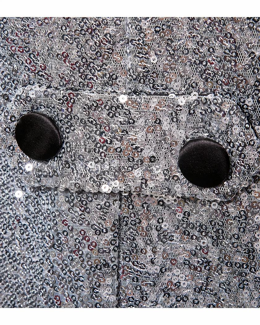 Ce blazer à paillettes queue de pie est réalisé avec soin et comporte six boutons noirs couturiers, c'est à dire recouverts de tissu, plus deux sur la petite martingale au dos. Le revers cranté noir est satiné pour ajouter encore un peu de chic. Le vêtement est entièrement doublé, bien évidemment. Il est proposé en six couleurs pour que chacun puisse trouver son préféré.