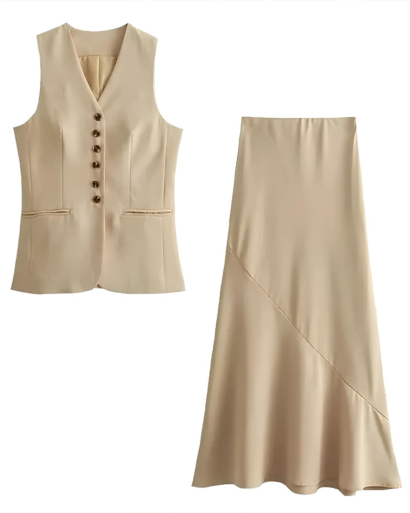 Une pièce qui s'adapte et reste facile à porter en voyage ou au quotidien. Cet ensemble répond à ce besoin : le gilet structure juste ce qu'il faut, tandis que la jupe longue vous apporte une grâce fluide.