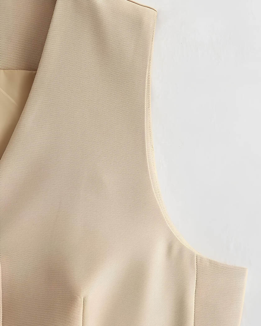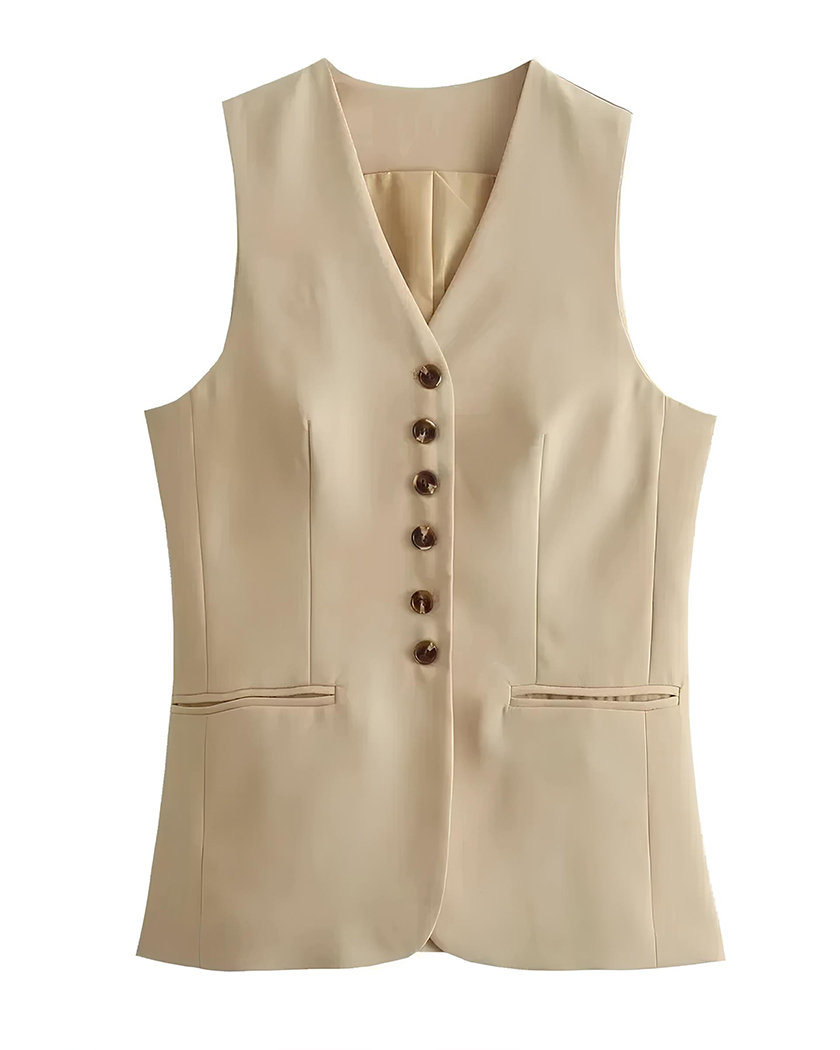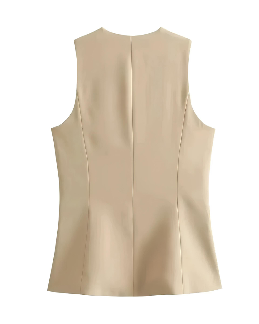 Son tissu léger glisse avec fluidité à chacun de vous mouvements et vous fait une promesse de confort même lorsque les températures changent. Le gilet sans manches présente une coupe droite impeccable, un décolleté en V net et une ligne de boutons qui structure votre silhouette.