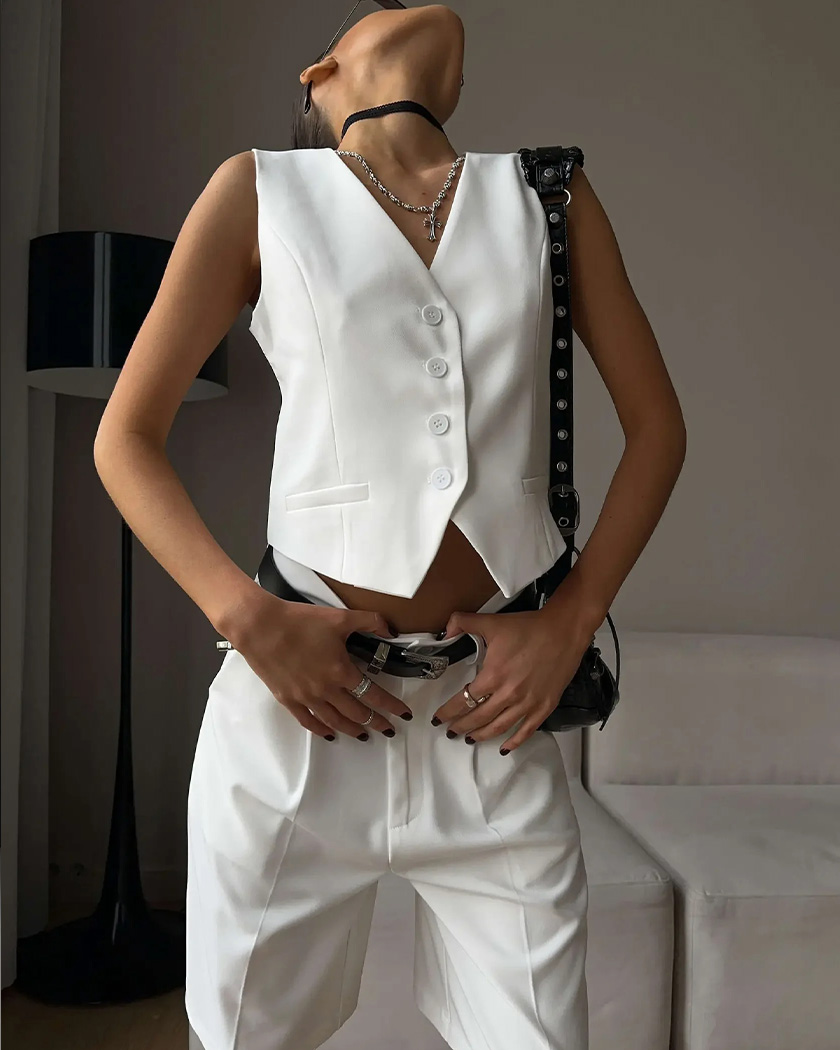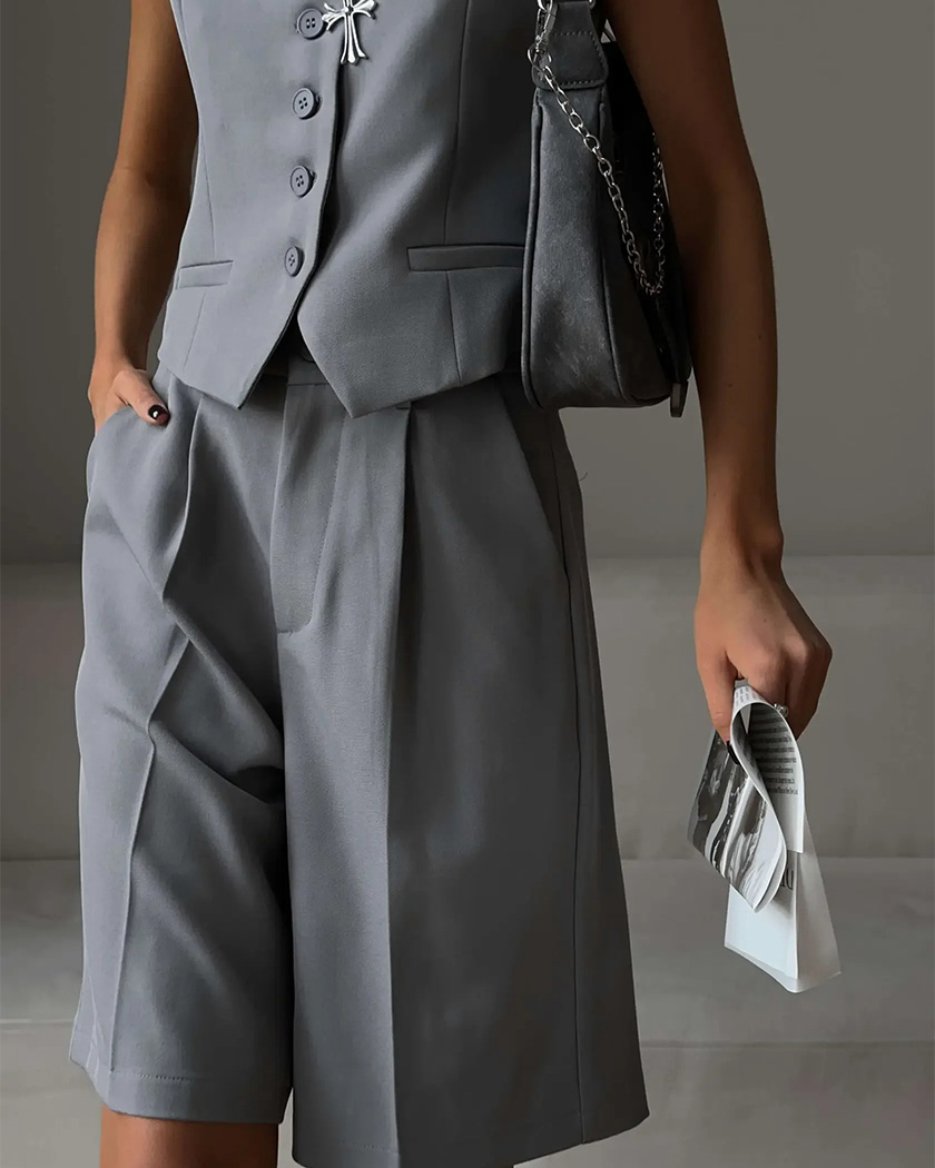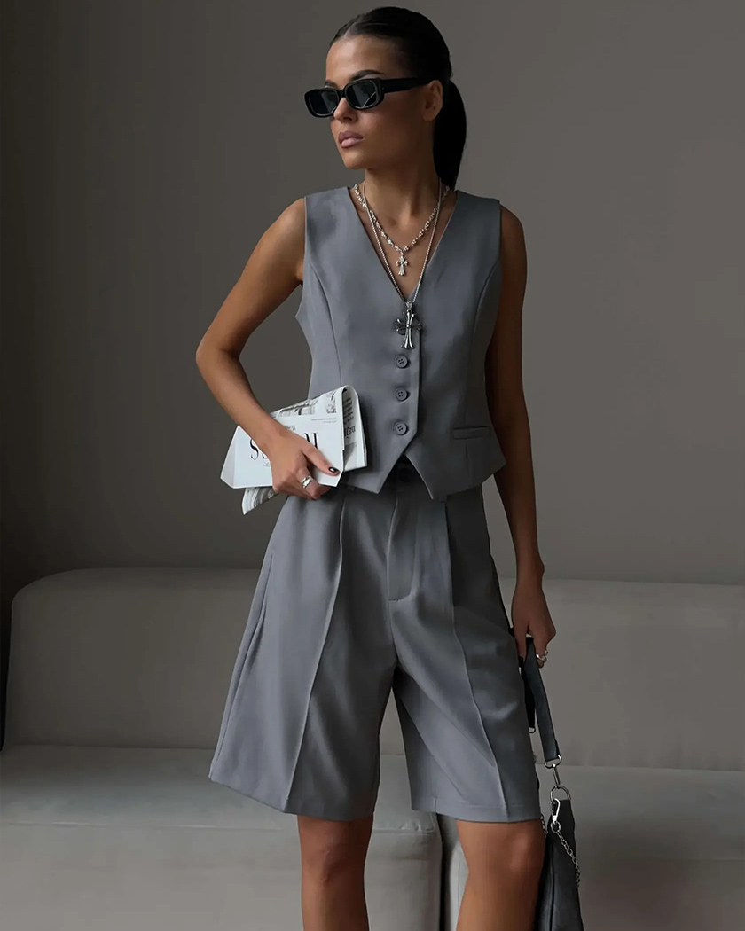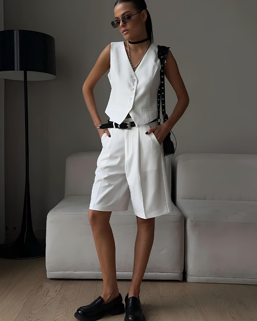 Cet ensemble gilet et short long répond à ce défi. Il offre la structure d'un tailleur revisité, avec une modernité affirmée et confortable.