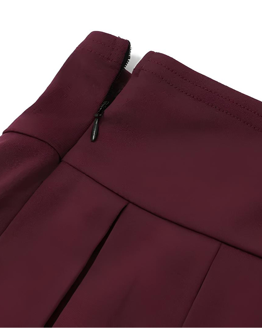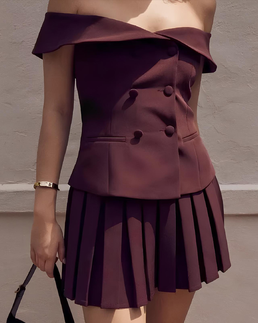 Le décolleté bardot de son blazer ajusté dévoile délicatement vos épaules, créant cette ligne élégante qui met en valeur vos atouts sans les dévoiler. Sa coupe structurée contraste idéalement avec la jupe plissée et fluide qui se déploie en mouvement à chacun de vos pas.
