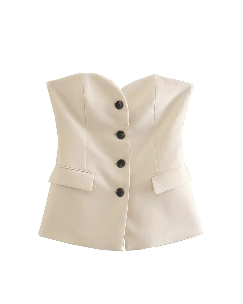 Sa conception soignée et son tissu de qualité offrent un tombé impeccable et une agréable sensation de légèreté. Le gilet bustier épouse votre silhouette avec son décolleté cœur et sa ligne de boutons contrastants, tandis que les poches à rabat ajoutent une touche tailleur traditionnelle.