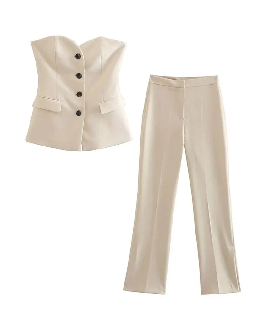 Vous cherchez donc cette alternative qui combine la structure impeccable et une touche de féminité affirmée, sans compromis. Cet ensemble est la réponse : son bustier offre un look léger et le pantalon une élégance fluide, créant un équilibre parfait.