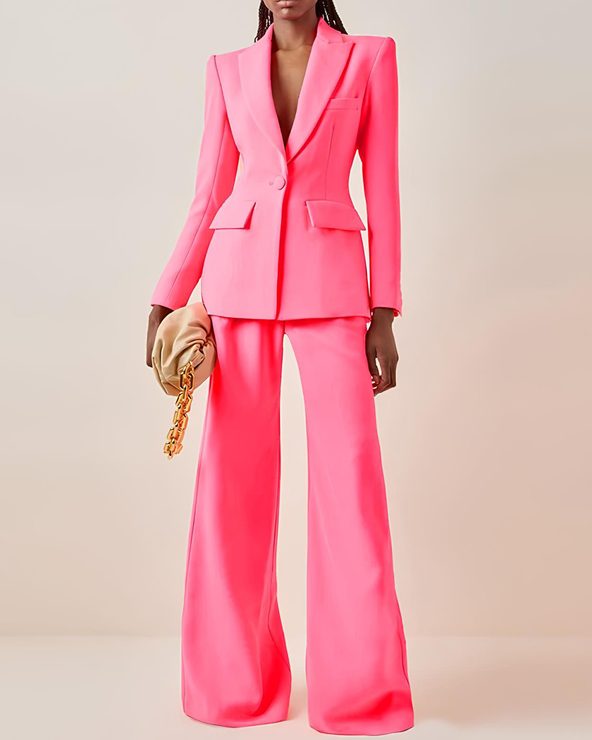 Ce tailleur-pantalon à la teinte rose vibrant change la donne. Il vous apporte cette audace maîtrisée et cette capacité à marquer les esprits avec sophistication sans avoir à forcer.