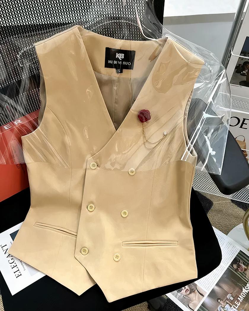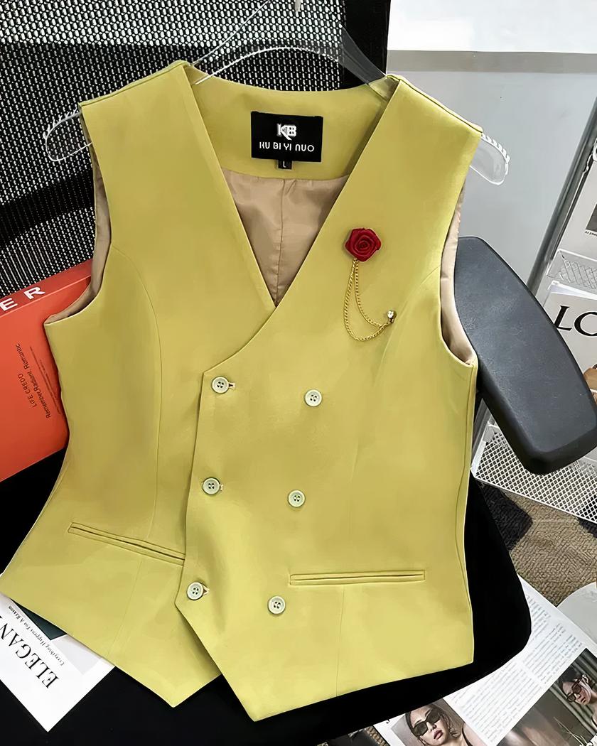 Disponible dans quatre coloris captivants : du classique noir, au raffiné beige, en passant par le sophistiqué rose poudré et le rayonnant jaune, notre gilet blazer à double boutonnage s'adapte à toutes les occasions, et tous les styles. Que ce soit pour une réunion professionnelle ou une soirée entre amis.