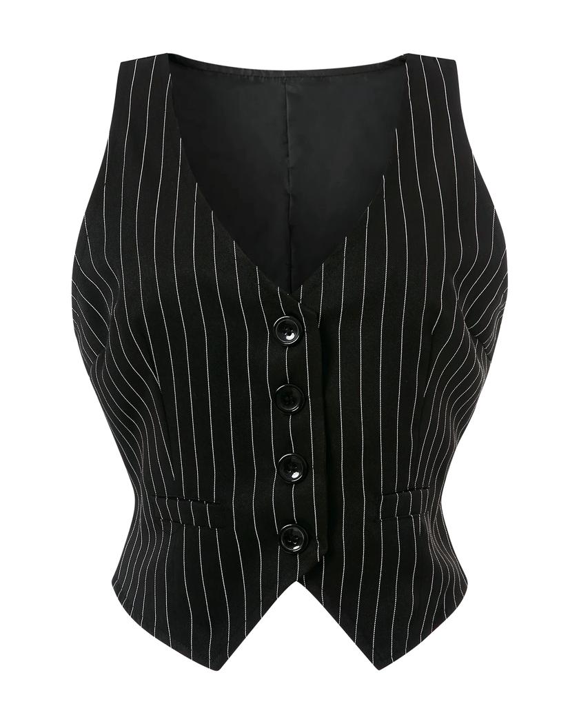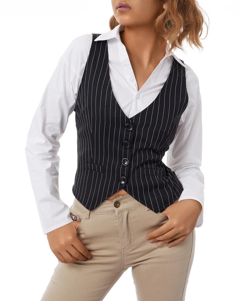 Découvrez notre gilet habillé sans manches pour femme. Avec ses quatre boutons à l’avant, il est facile à mettre et à retirer. Décliné en noir ou noir et blanc à fines rayures, il est très élégant.
